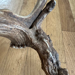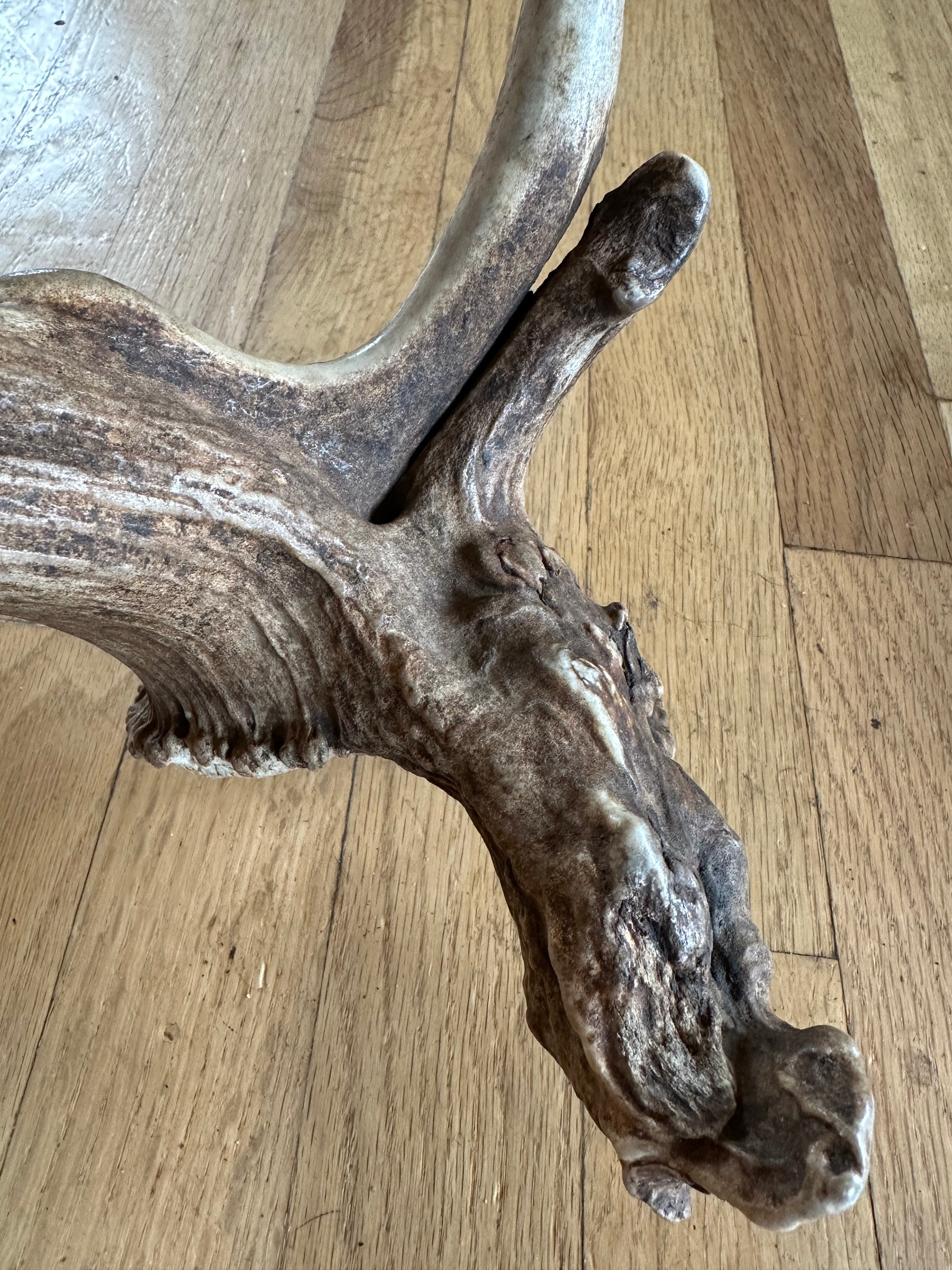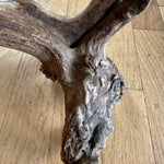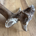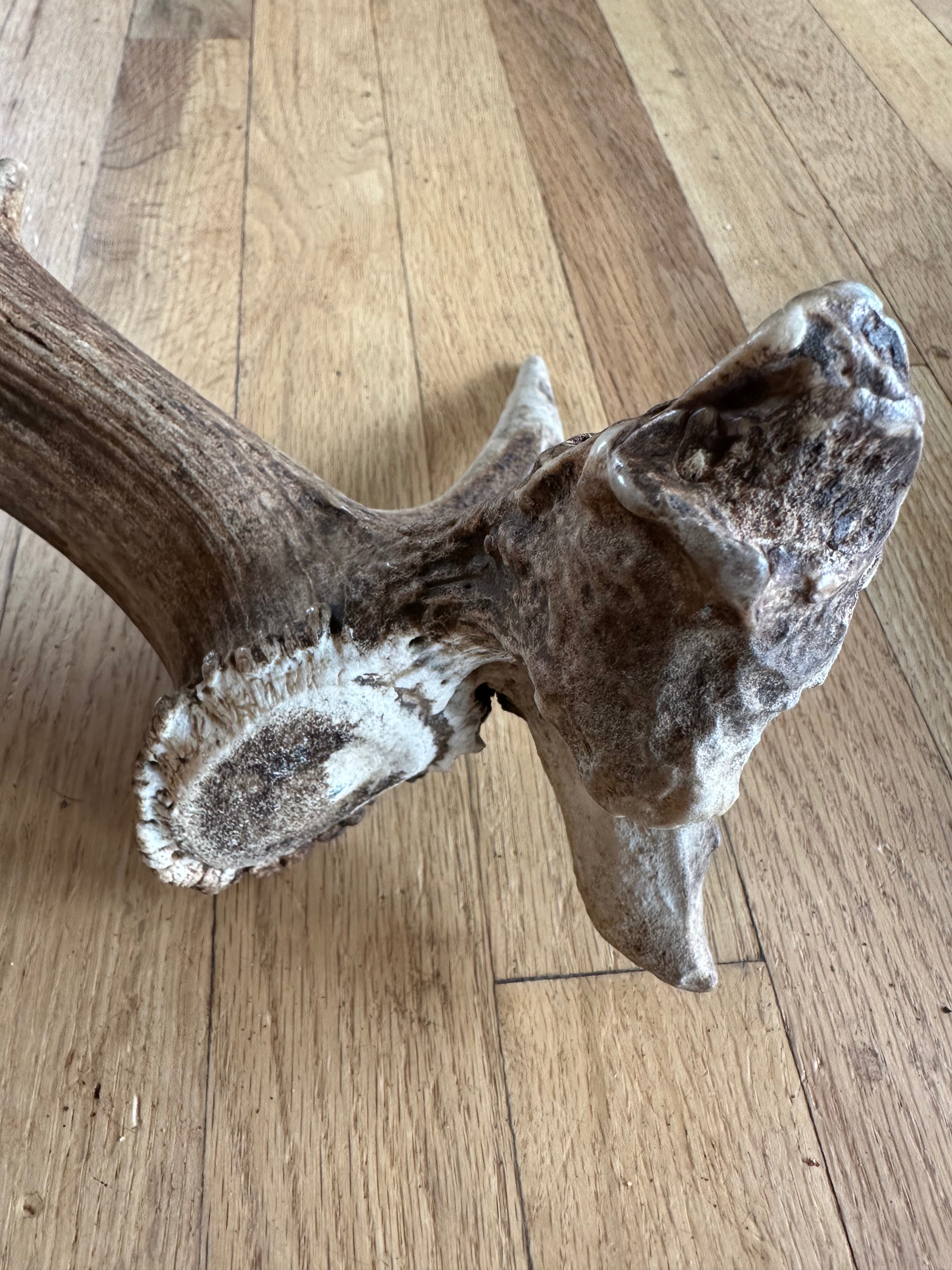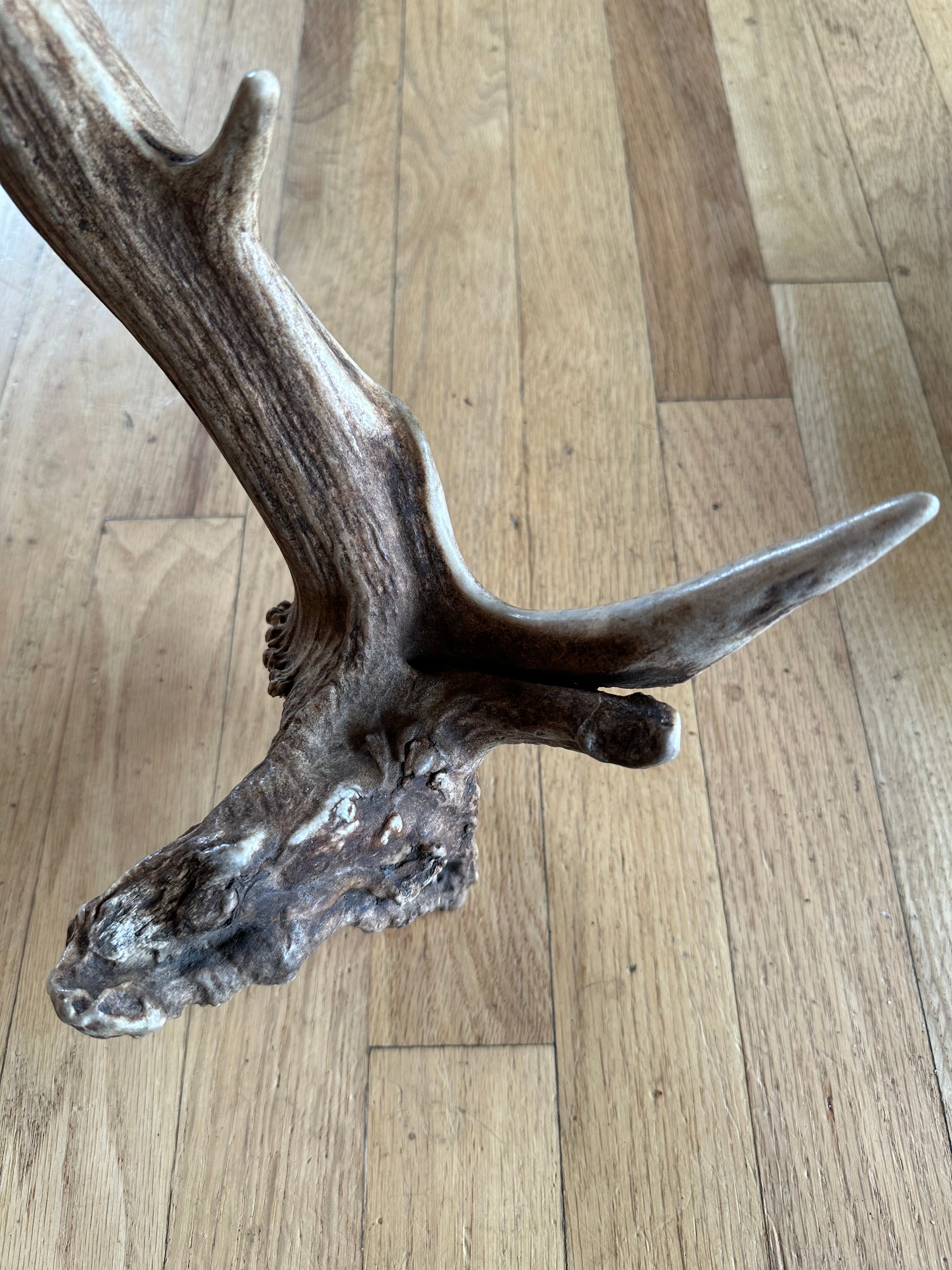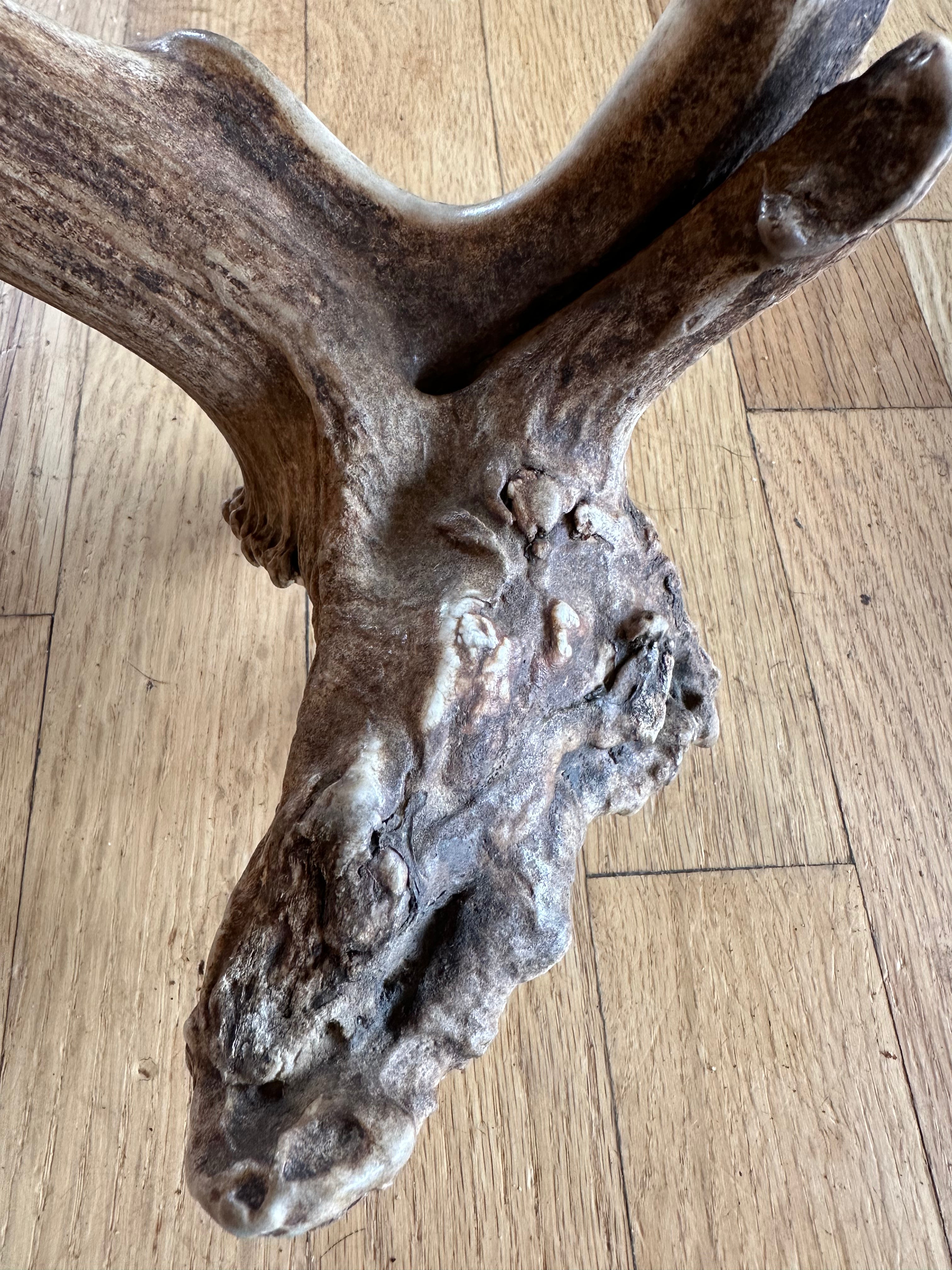 Peculiarly beautiful Elk antler with a "lava glob" base near the burr. Closely peep the detail: this antler is pure art! Likely damaged by running into wire during velvet growth (cattle fencing), this free range elk shed grew into something extraordinary! Collector quality