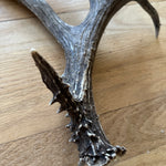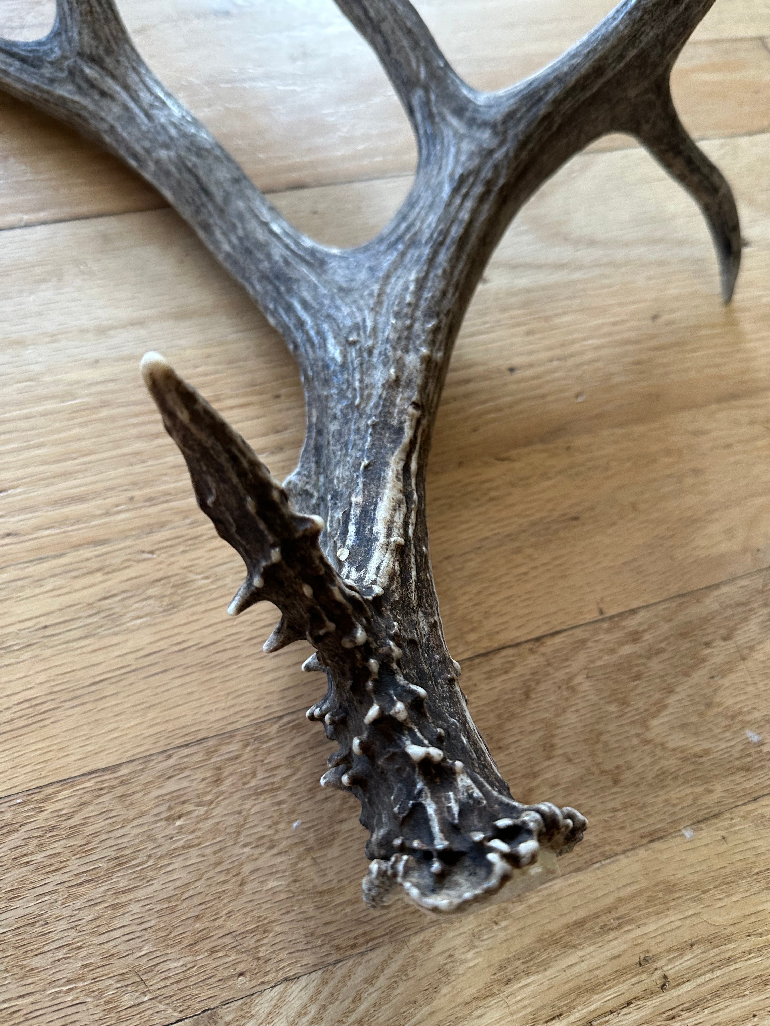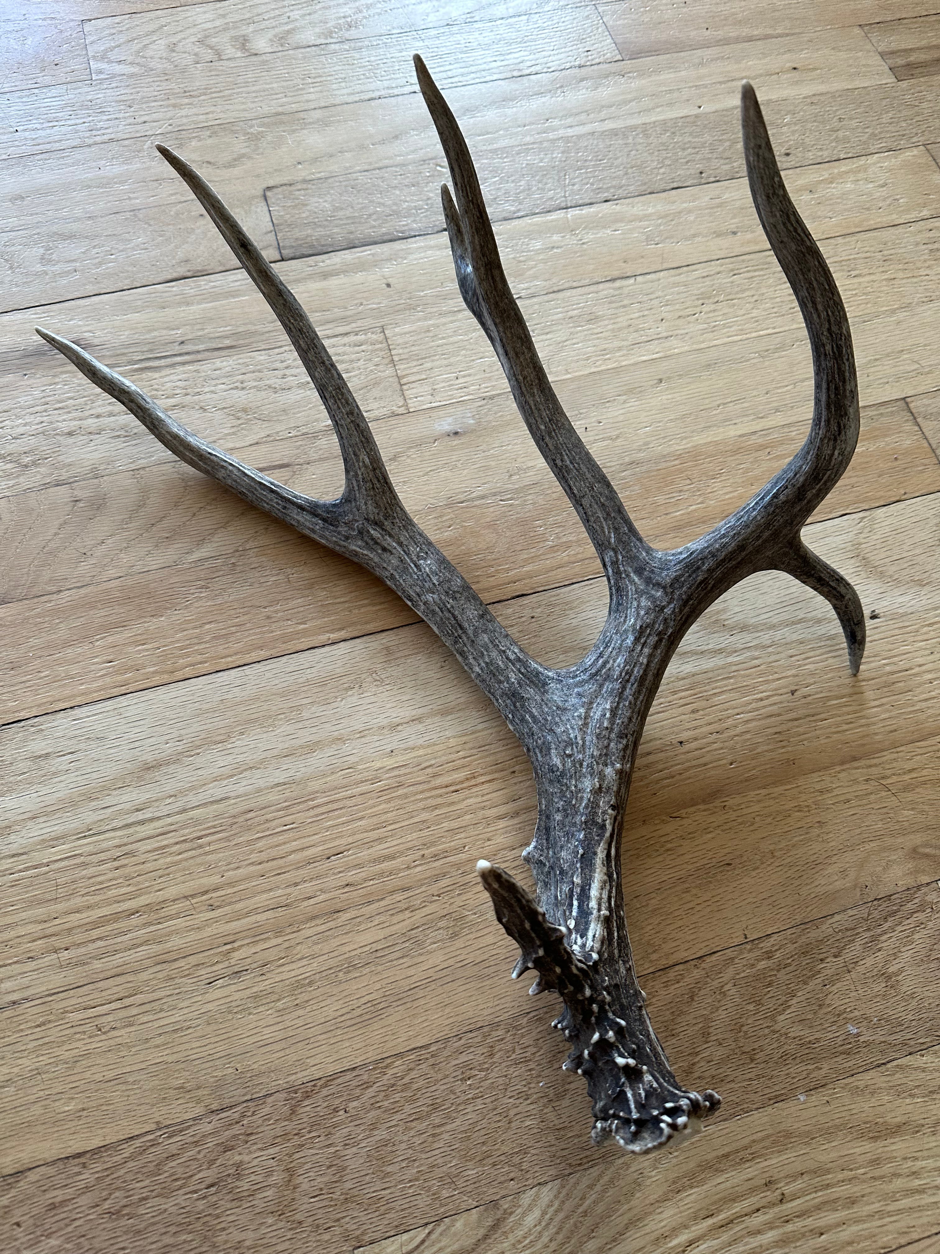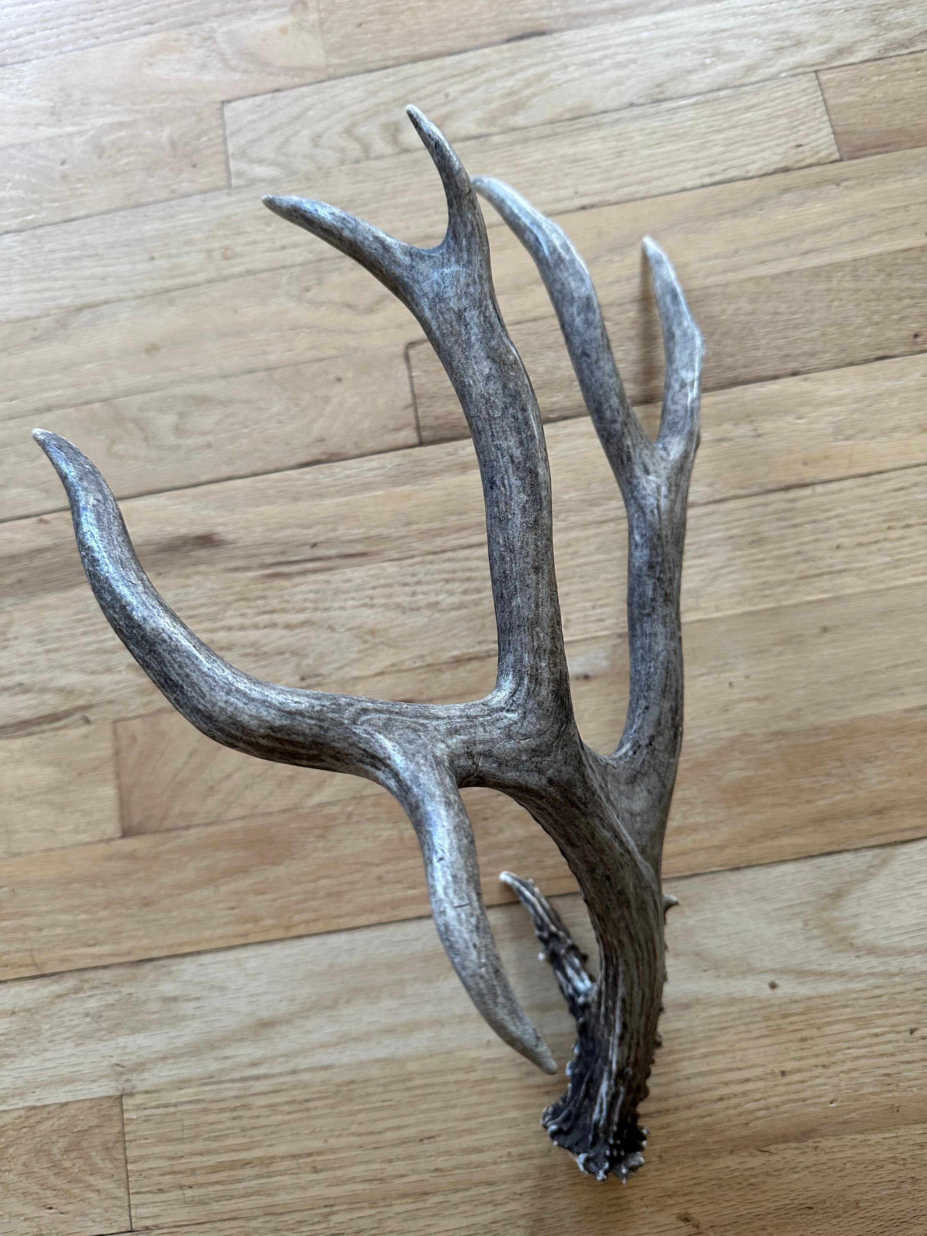 Non-typical Mule Deer shed with a drop tine, bladed palmation and a unique eye guard with a knobby base. Black and charcoal tones from the buck living in a burn area. Absolutely stunning antler that would make a gorgeous centre piece, or compliment any cabin decor